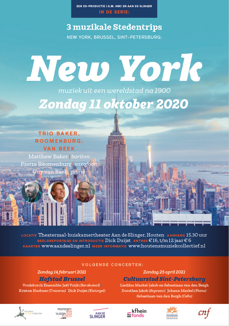 Het Trio Baker-Roomenburg-Van Beek speelt 11 oktober in De Grote Zaal van Theater Aan de Slinger haar New York programma. Tussen de stukken door toelichting over kunst, architectuur en de componisten door Dick Duijst. Corona-proof opstelling met o.a. 45 tafeltjes voor 1 of 2 personen. Tijdslot van binnenkomst bij aanvang.